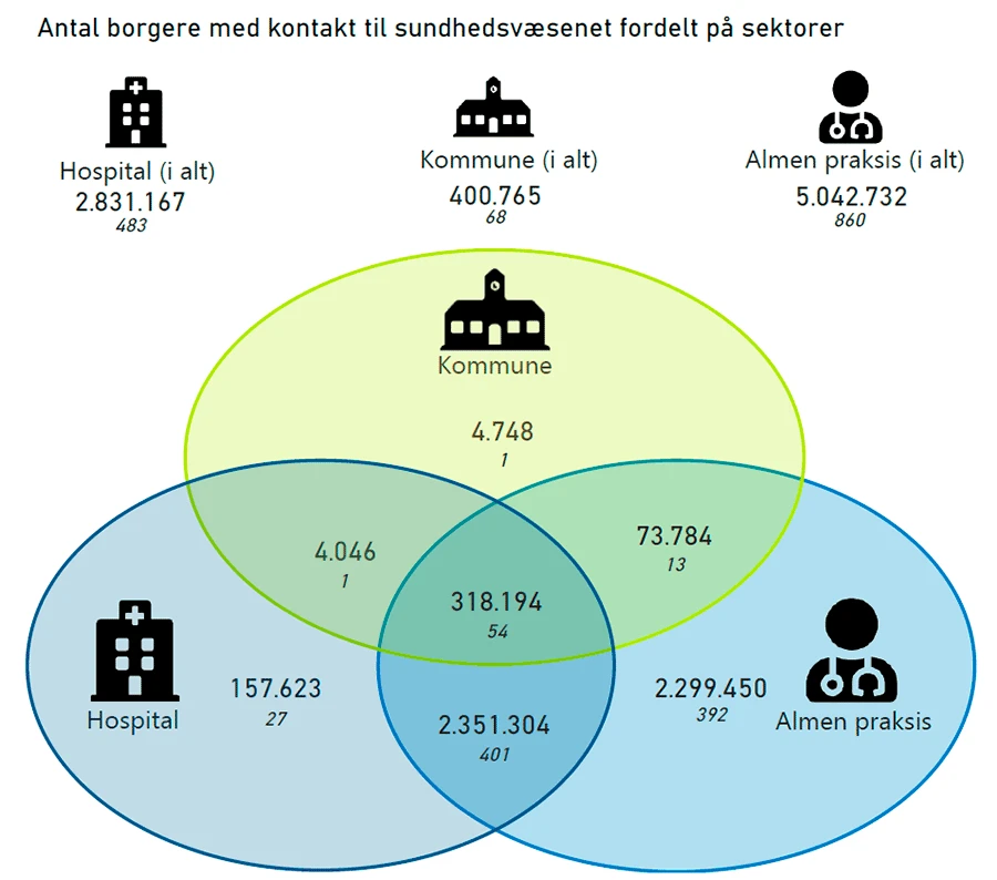 Det er muligt at se på fælles patientpopulationer på tværs af de tre sektorer og afgrænse data til, om borgerne har en kronisk sygdom eller bor på plejehjem. Visningerne kan fx fordeles eller afgrænses på bopælskommune, bopælsregion, sundhedsklynger og almen praksis-klynger.