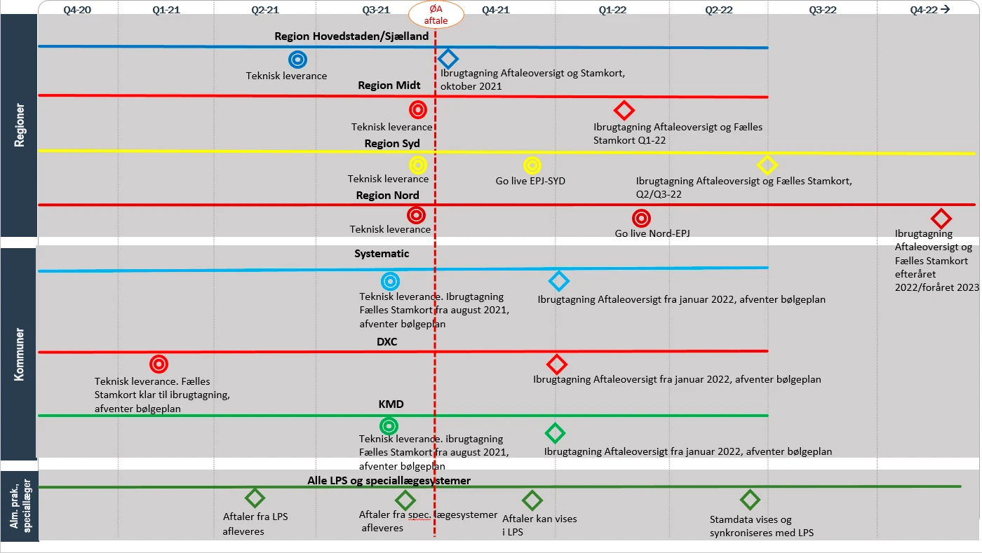 Der er sket ændringer i den samlede tidsplan for implementeringen af Aftaleoversigten og Fælles Stamkort. De fremgår af den samlede tidsplan herunder. Som noget nyt kan man her også se de praktiserende speciallæger, der fra september 2021 forventes at aflevere aftaler til Aftaleoversigten.