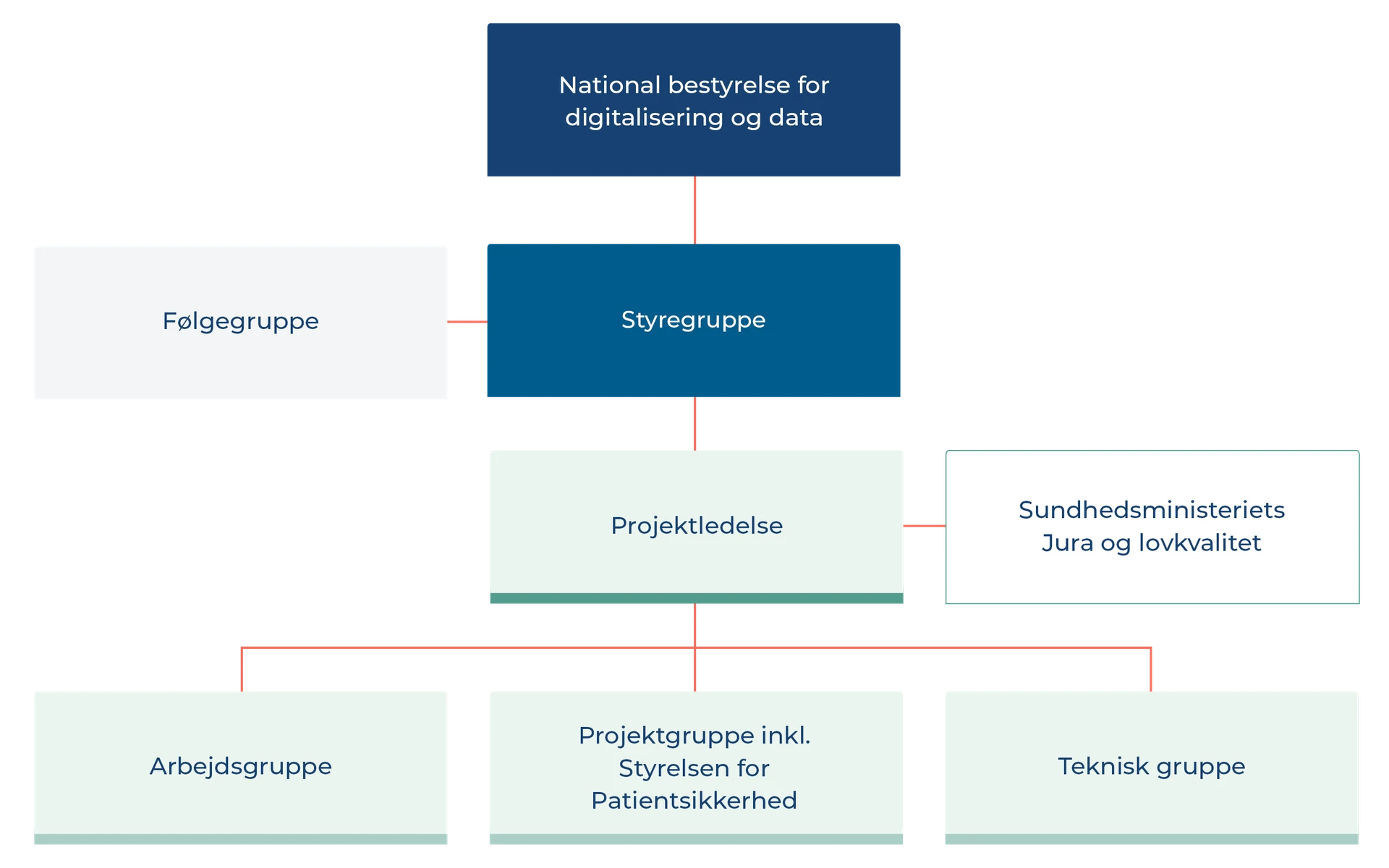 Projektet refererer til National bestyrelse for digitalisering og data på sundheds- og ældreområdet, som følger den overordnede status på projektet.