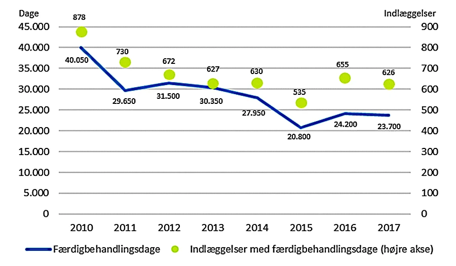 I perioden 2010-2017 er antallet af indlæggelser med færdigbehandlingsdage faldet fra godt 880 til knap 630. Og samtidig er det gennemsnitlige antal sengedage efter endt behandling faldet fra 45,6 dage i 2010 til 37,8 dage i 2017.