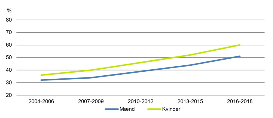 Kurverne vender også fortsat i den rigtige retning, når det gælder, hvor mange der lever fem år efter kræftdiagnosen for de 15 udvalgte kræftformer samlet set, med en forbedring på ét procentpoint for både mænd og kvinder siden 2013-2015. Den 5-årige overlevelse er 66 procent blandt mænd og 68 procent blandt kvinder i perioden 2016-2018.