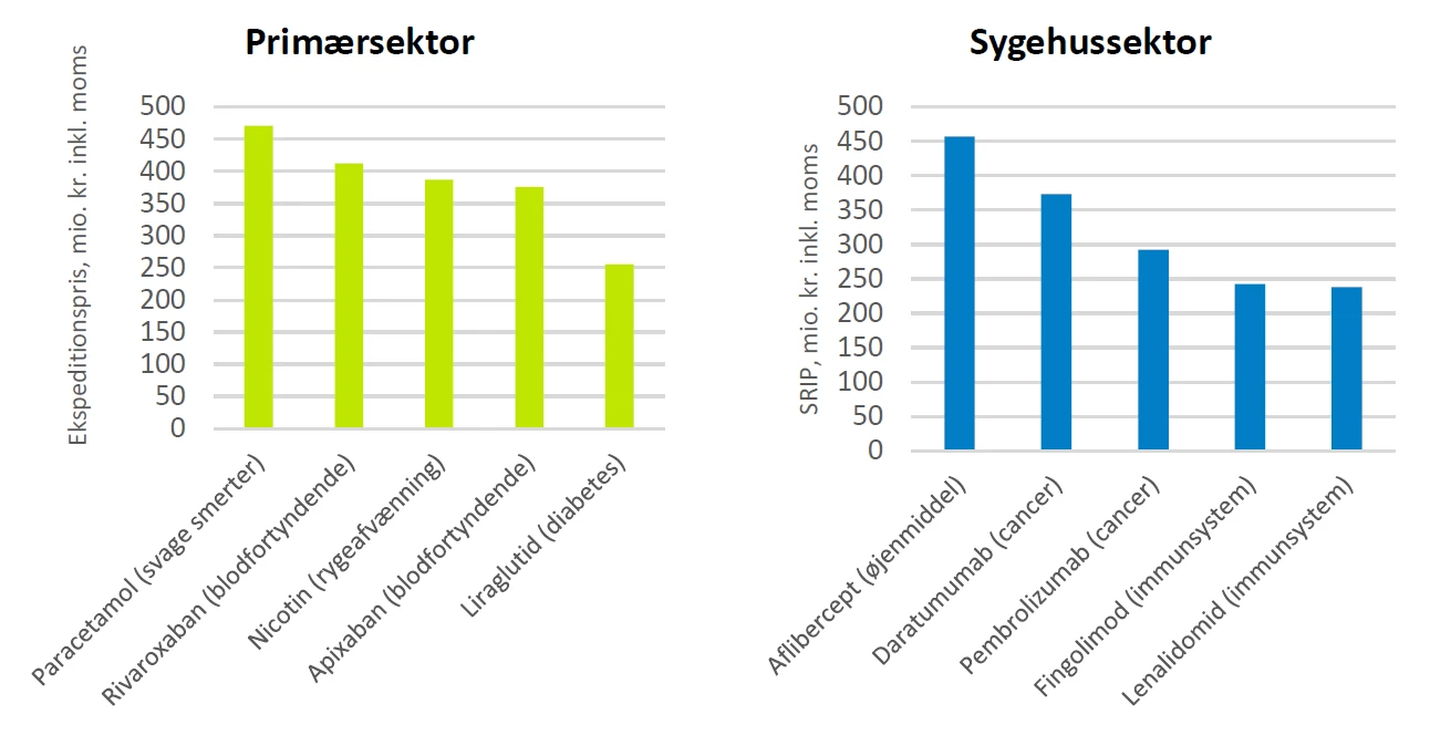 Kilde: Lægemiddelstatistikregisteret (opdateret 21. september 2020), Sundhedsdatastyrelsen. Note: Omsætningen i primærsektoren er opgjort i ekspeditionsprisen (mio. kr. inkl. moms), mens omsætningen i sygehussektoren er opgjort i den sidst registrerede indkøbspris, SRIP (mio. kr. inkl. pålagt moms).
